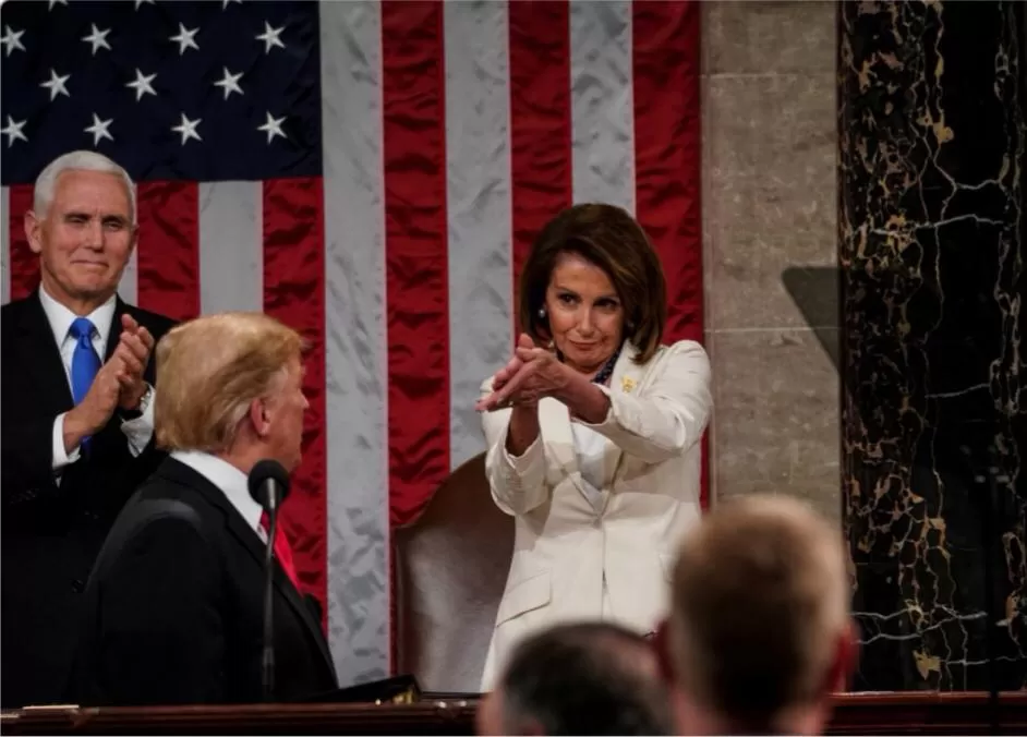 Saat itu Nancy menepuki Presiden Donald Trump. Yang lagi di posisi di depannya. Setelah Trump berpidato. Yang podiumnya persis di depan kursi ketua DPR.