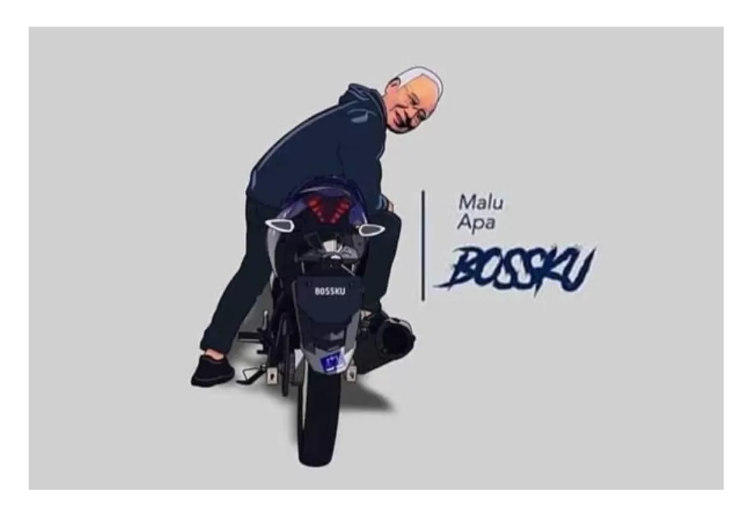 Kausnya warna merah. Depannya ada gambar dirinya: lagi naik sepeda motor Yamaha. Di depannya tertulis motto: Malu Apa Bossku.