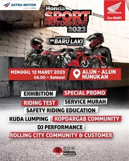Pada Honda Sport Motoshow kali ini, terdapat rangkaian kegiatan seperti exhibition, special promo, riding test, service murah, safety riding education, kuda lumping, kopdargab community, dj performance dan rolling city community & customer.