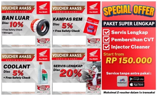 Pada promo 1-30 Juni 2023 AHASS bengkel resmi Honda memberikan promo voucher motor kesayangan anda. Promo tersebut berlaku untuk wilayah Balikpapan, PPU, Paser, Berau dan Kaltara.