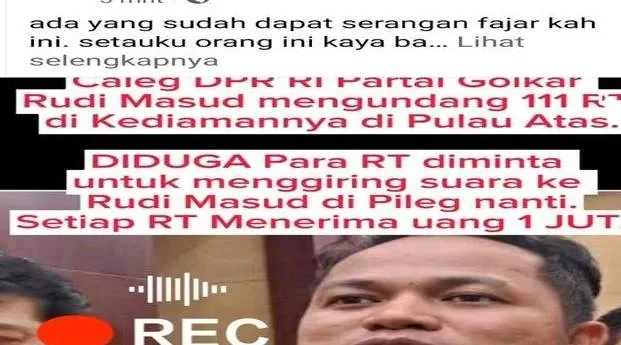 Beredar di sosial media yang menyampaikan tentang dugaan seorang Caleg DPR RI undang 111 Rukun Tetangga (RT) datang ke kediamannya, di Samarinda, Kalimantan Timur. Dan diduga para RT yang diundang tersebut, diminta untuk kemudian menggiring suara kepada Caleg tersebut, dan setiap RT akan menerima uang Rp 1 juta.