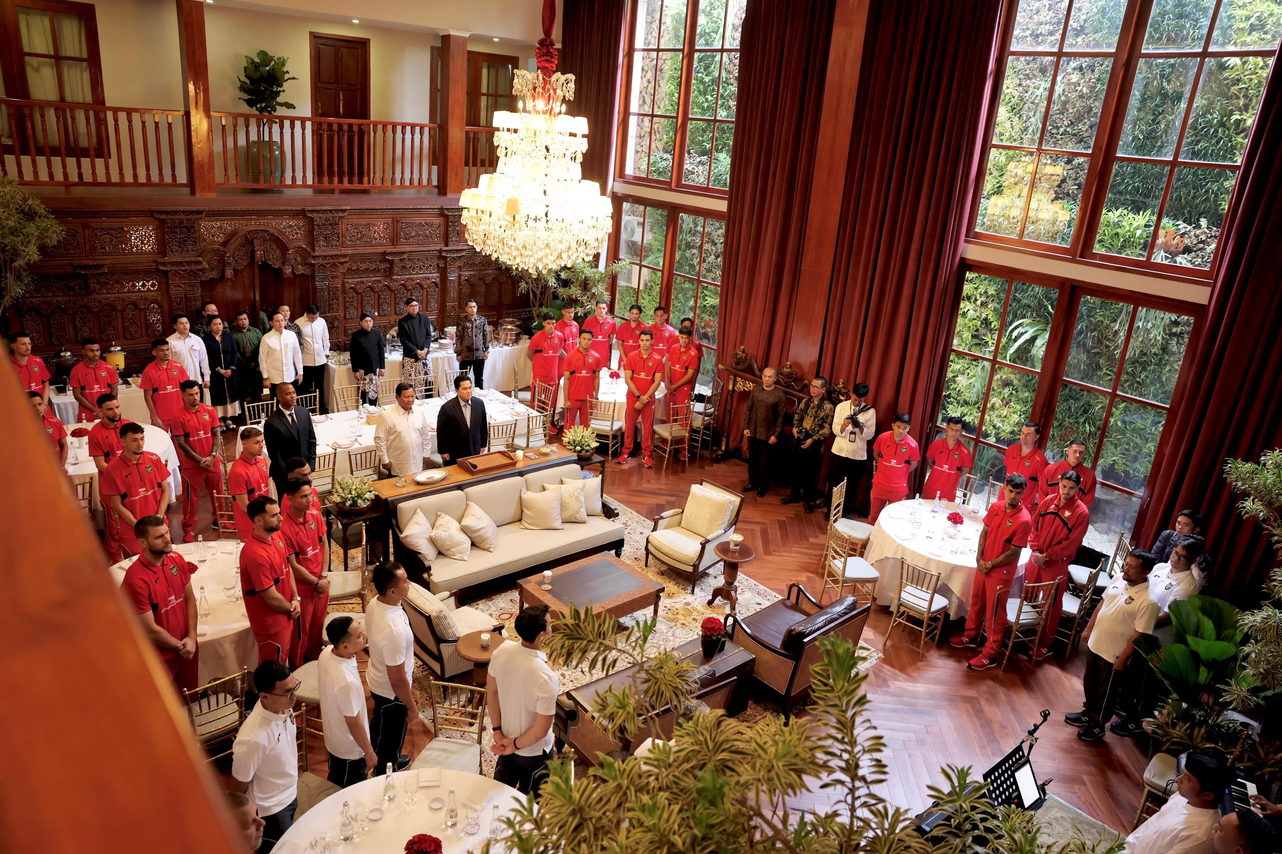 "Terima kasih banyak telah datang ke rumah saya dan menerima undangan ini. Terima kasih atas kerja keras kalian, kami sangat menghargai kalian dan menghargai perjuangan kalian untuk kami dan bersama kami," ujar Prabowo dalam sambutannya kepada para pemain.
