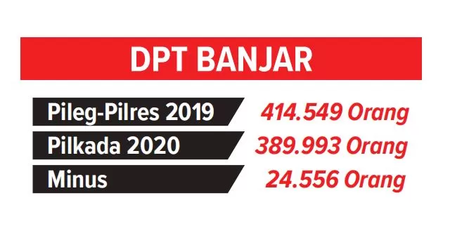 MARTAPURA – KPU Banjar menetapkan daftar pemilih tetap Pilkada 2020 hanya 389.993 orang. Artinya, menyusut atau hilang sekitar 24.556 jiwa dari DPT Pileg-Pilres 2019. Setahun lalu, total DPTHP 2 hasil pleno 10 Desember 2018 berjumlah 414.549 pemilih.