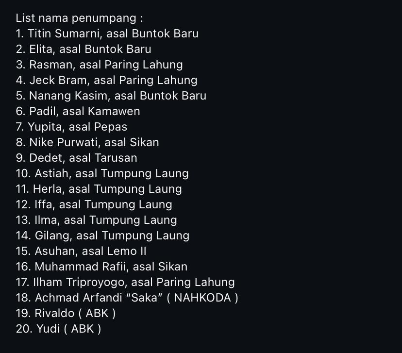 Berdasarkan laporan Tim Reaksi Cepat (TRC) BPBD Barito Utara, sebanyak 20 orang berhasil dievakuasi, terdiri dari 17 penumpang, satu motoris, dan dua anak buah kapal (ABK).
