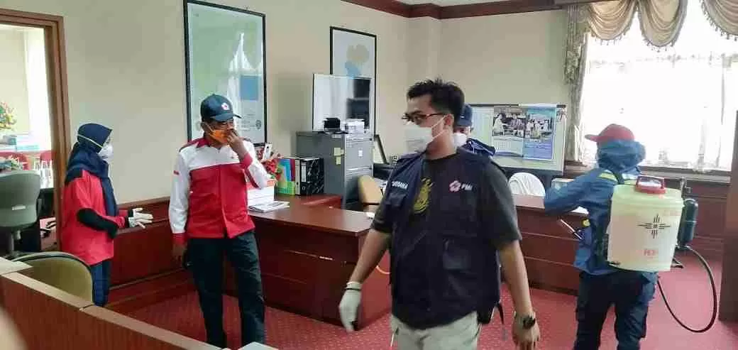 PENAJAM - Untuk meminimalisir dan memutus mata rantai penyebaran virus Corona atau Covid-19, relawan dari Palang Merah Indonesia (PMI) Kabupaten Penajam Paser Utara (PPU) melakukan penyemprotan disinfektan ke sejumlah Kantor Pemerintah dan fasilitas umum lainnya di empat kecamatan se Kabupaten PPU secara bertahap. Salah satunya seperti tampak dilakukan di Kantor Bupati PPU, Senin, (30/03).