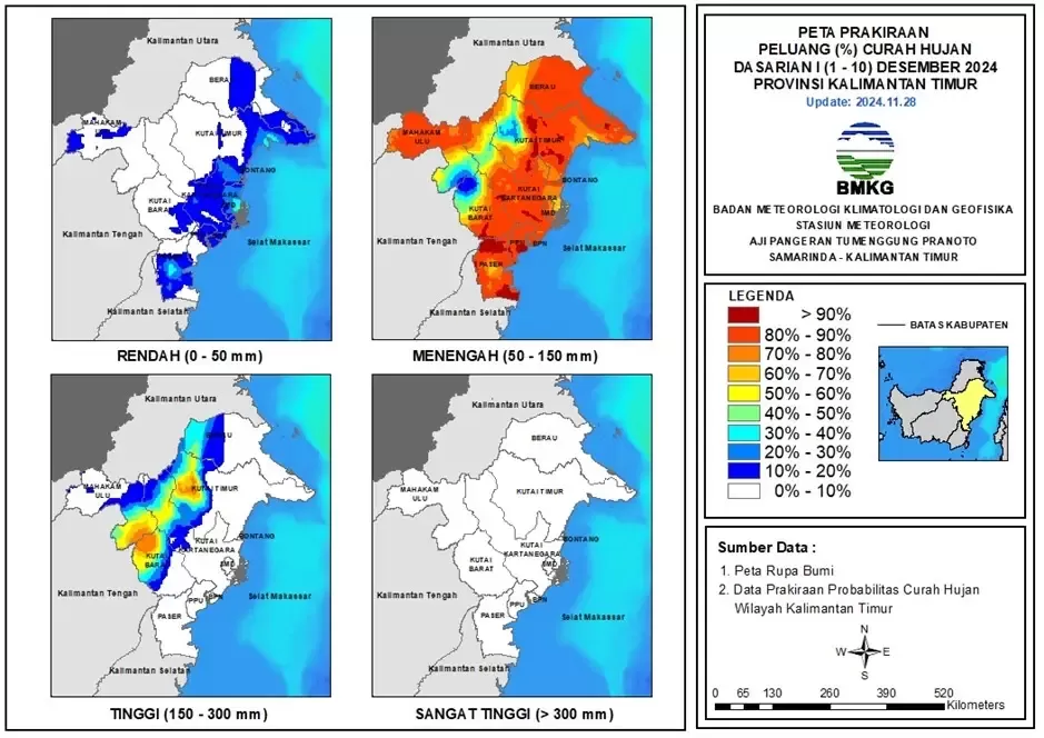 Berdasarkan hasil pemantauan badan Meteorologi, Klimatologi, dan Geofisika (BMKG) Stasiun APT Pranoto Samarinda memprediksi secara umum wilayah Kalimantan Timur diprakirakan akan terjadi hujan pada kategori menengah 50-150 mm dengan peluang lebih dari 80 persen pada dasarian I tanggal 1-10 Desember 2024.