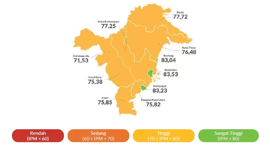 Meski masih berada pada kategori “Tinggi” (70 ≤ IPM < 80), kemajuan signifikan di Penajam Paser Utara dan Mahakam Ulu menunjukkan bahwa pembangunan manusia di Kaltim mulai bergerak lebih merata.