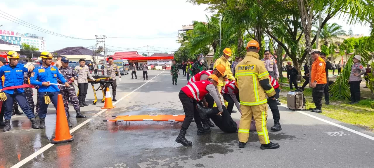 Simulasi ini menggabungkan tiga skenario bencana yang paling sering terjadi, yaitu kebakaran lahan, banjir, dan longsor. Seluruh rangkaian dirancang berkesinambungan, mulai dari upaya pemadaman kebakaran lahan yang merembet ke permukiman, evakuasi korban banjir, hingga penanganan korban dalam situasi longsor. Setiap skenario dijalankan layaknya kondisi nyata untuk menguji kecepatan respons, kekompakan tim, serta efektivitas komando di lapangan.
