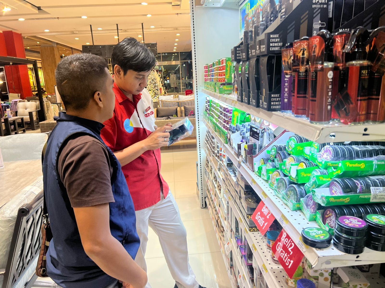 Di AZKO semua karyawannya ramah. Customer yang datang di pintu masuk selalu disambut dengan sapaan dan senyuman. Mereka menawarkan bantuan untuk mencari produk yang dibutuhkan. “Saya butuh barang-barang elektronik dan perabotan rumah tangga untuk hadiah doorprize,” jawab Debi.