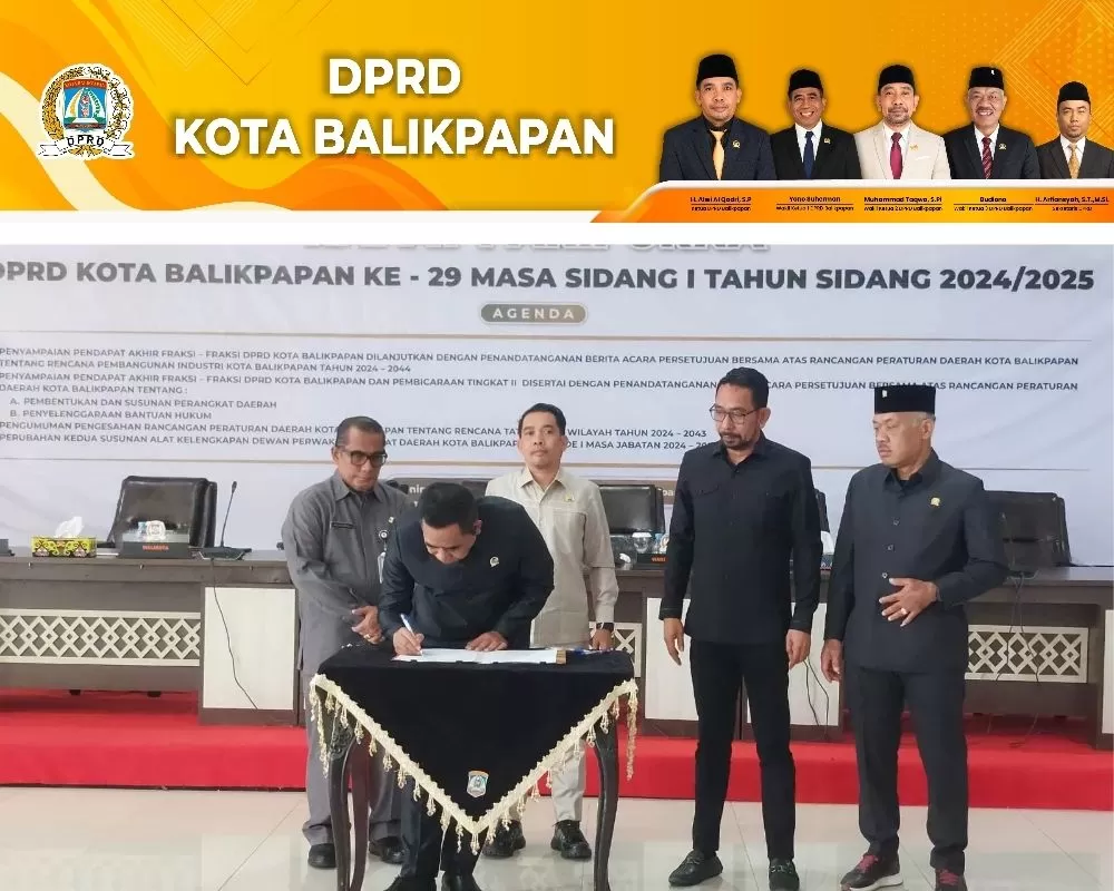 Ada pun sebagai penutup dilakukan penandatangan berita acara persetujuan bersama. Seluruh pimpinan DPRD Balikpapan dan Sekretaris Daerah Balikpapan Muhaimin mewakili Pemkot Balikpapan menandatangani dokumen persetujuan.