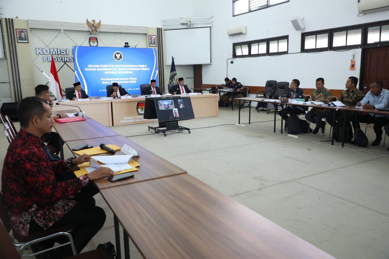 PROKAL.CO, SAMARINDA - Dewan Kehormatan Penyelenggara Pemilu (DKPP) memeriksa Ketua dan dua Anggota Bawaslu Kabupaten Mahakam Ulu dalam sidang dugaan pelanggaran Kode Etik Penyelenggara Pemilu (KEPP) untuk perkara Nomor 142-PKE-DKPP/IV/2025 di Kantor KPU Provinsi Kalimantan Timur (Kaltim), Kota Samarinda, Rabu (24/9/2025).